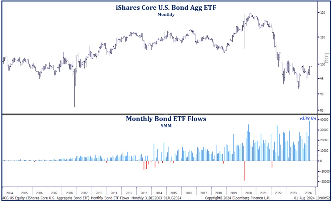 根据 Strategas 的数据,7 月份债券基金的资金流入量约为 390 亿美元,创下历史最高纪录。投资者在固定收益领域大肆挥霍资金,从期限较长的政府债券、美国公司发行的短期债券到市政债券 ETF。