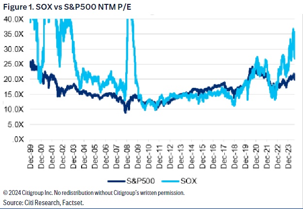 期望过高:美国半导体指数(SOX)的市盈率为 37 倍,较标普 500 溢价 70%,为 2008 年以来的最高水平。