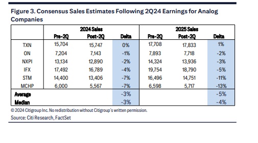模拟芯片补库存尚未发生:除德州仪器外,其他模拟公司的预期销售额均被下调。