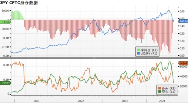 上周 CFTC 持仓显示:日元投机性空头已经连续 4 周大幅砍仓,净空头从 7 月初 18.4 万份的高峰,降至 1.1 万份,是 2021 年 2 月以来的最低水平。