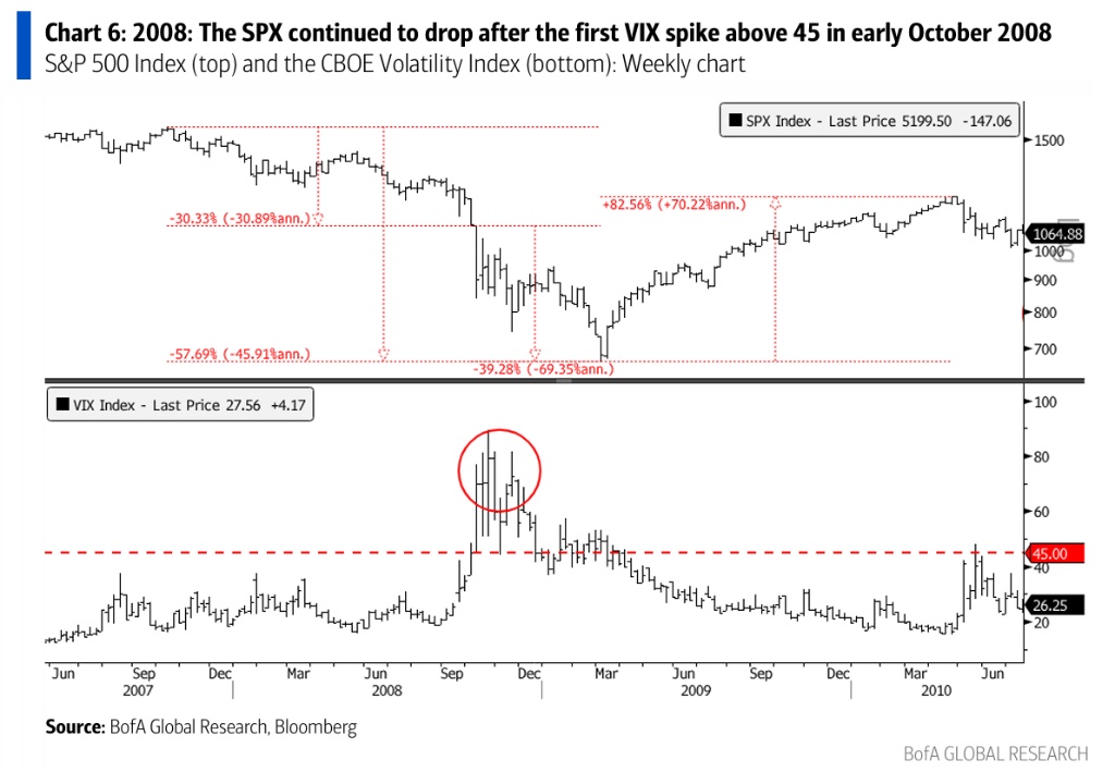美银指出,当 VIX 指数首次大幅上涨至 45 以上时,标普 500 指数在接下来的 4 到 8 周内可能会表现不佳。
