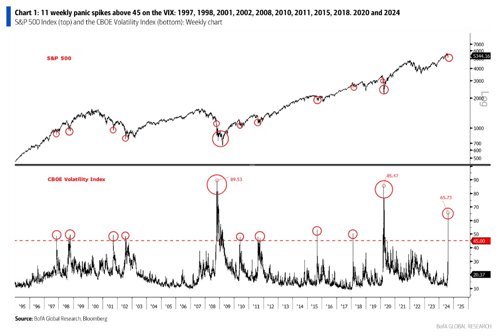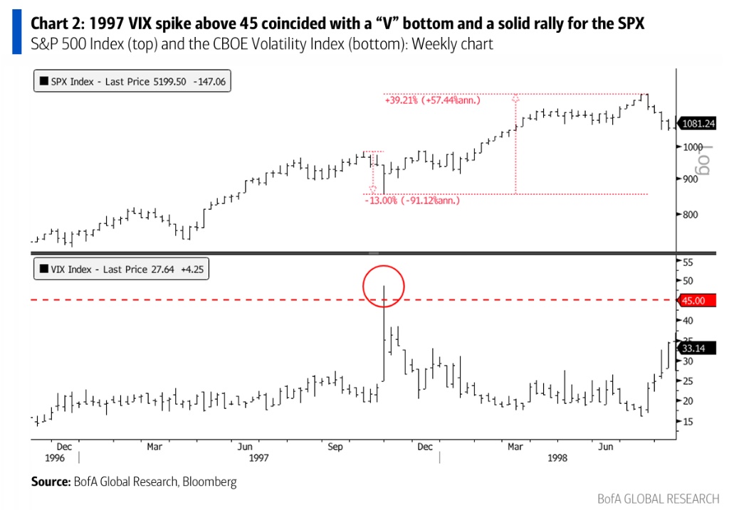 美银认为,2024 年 8 月的 VIX 指数飙升与 1997 年 10 月和 2018 年 2 月的相似,均发生在标普 500 指数接近 40 周均线的时候。