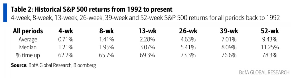 美银指出,VIX 指数首次飙升后的 4 至 8 周内,标普 500 的表现往往较为挣扎;当 VIX 在一周内飙升至 45 点以上时,随后 13 周、26 周、39 周和 52 周,标普 500 指数往往能够实现较高的回报率。