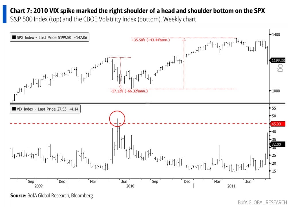2010 年 4 月下旬至 7 月初,标普 500 回调 17.1%。在 2010 年 5 月 21 日的一周内,VIX 指数短暂突破了 45 点,但随后回落至 45 点以下。