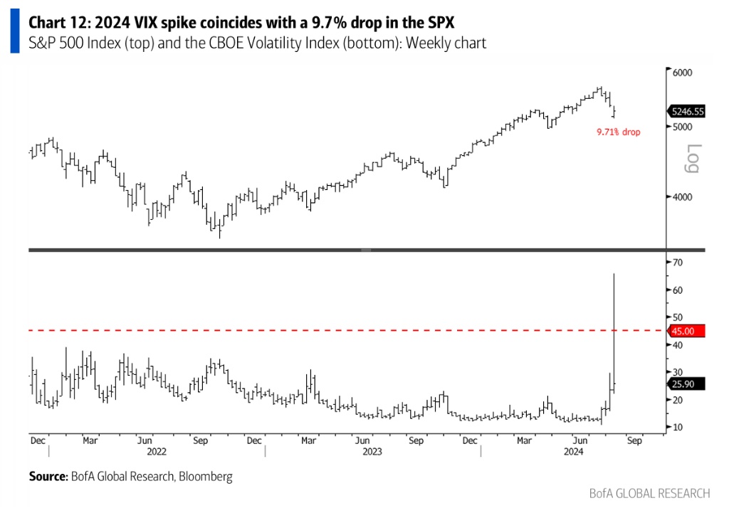 上周,VIX 指数的暴涨无疑向市场发出了一份紧急警报。VIX 指数在 8 月 5 日飙升至 65.73,创下疫情时飙升至 85.47 以来的最高水平,标普 500 指数大幅下挫。随后 VIX 指数在 8 月 9 日收于 20.37,标普 500 指数反弹至 5300 点附近。