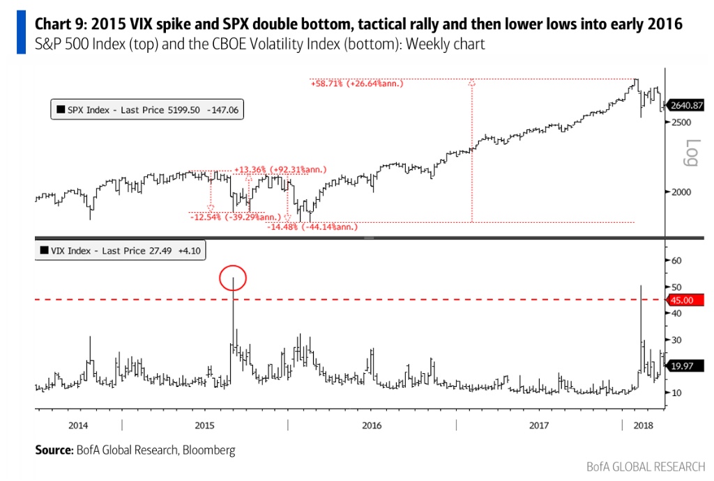 2015 年 8 月,VIX 指数短暂超过 45 点,但随后回落。此时,标普 500 指数正处于一个下跌趋势中,累计跌幅为 12.5%。从 2015 年 8 月的低点开始,标普 500 指数上涨了 13.4%,但在 2016 年 2 月初再次下跌了 14.5%,而 VIX 指数在此期间一直保持在 45 点以下。