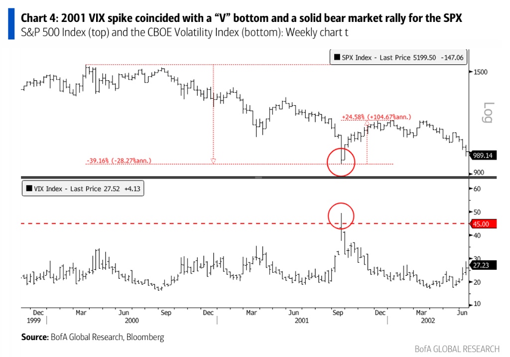 由于恐怖袭击事件,VIX 指数一度飙升至 49.35 的高点,但最终收盘于 42.66。标普 500 指数从 2000 年 3 月的峰值下跌了 39.2%,并在 9 月 21 日触底。随后,标普 500 指数并未再次跌破之前的低点,而是开始反弹,并在 2002 年 1 月初上涨了 24.6%。
