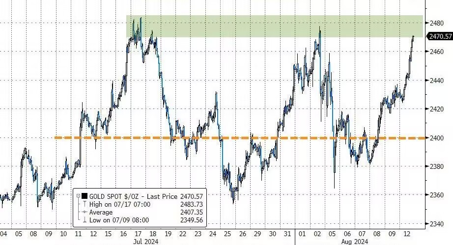 中东冲突扩大担忧叠加美债收益率下降,无论从哪个角度看,黄金现在都被视为一个受欢迎的交易,目前金价升至 2471 美元/盎司,距离 7 月中旬创下的历史最高一步之遥。