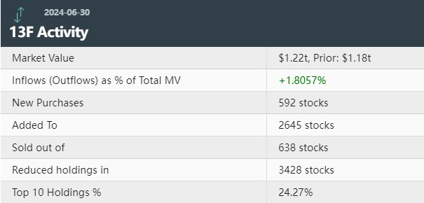 据统计,摩根大通第二季度持仓总市值为 1.22 万亿美元,上一季度总市值为 1.18 万亿美元,环比增长 3%。该基金在第二季度的投资组合中新增了 592 只个股,增持了 2645 只个股,减持了 3428 只个股,清仓了 638 只个股。其中前十大持仓标的占总市值的 24.27%。