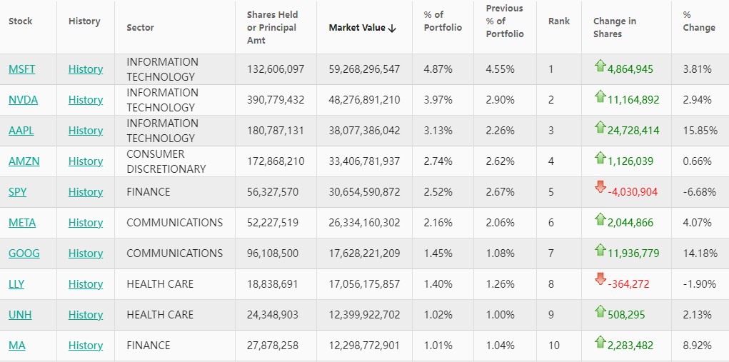 SPDR 标普 500 指数 ETF(SPY.US) 位列第五,持仓 0.56 亿股,持仓市值为 306.55 亿美元,占投资组合比例为 2.52%,较上季度持仓数量下降 6.68%。