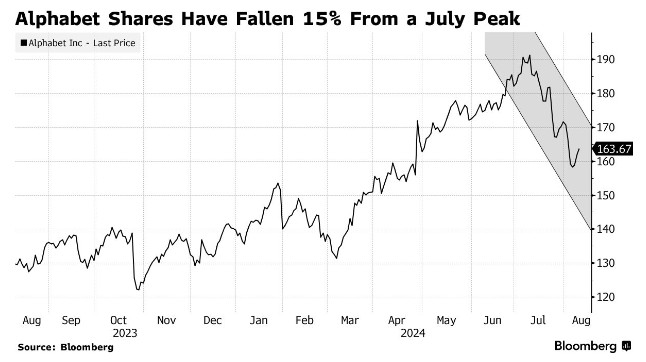 Alphabet 的股价已经从 7 月中旬的高点下跌了 15%。由于对美国经济增长放缓和估值过高的担忧,该公司与其他大型科技股一样面临压力,而投资者越来越担心,在人工智能方面的巨额支出相对较少。Alphabet 股价下跌,此前该公司第二季度资本支出高于预期,原因是该公司努力在人工智能领域超越竞争对手。