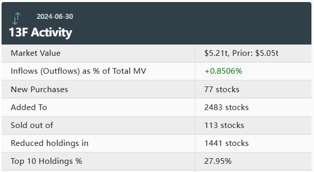统计数据显示,先锋集团第二季度持仓总市值达 5.21 万亿美元,上一季度总市值为 5.05 万亿美元。先锋集团在第二季度的持仓组合中新增了 77 只个股,增持了 2483 只个股。同时,先锋集团减持了 1441 只个股,清仓了 113 只个股。其中,先锋集团的前十大持仓标的占总市值的 27.95%。