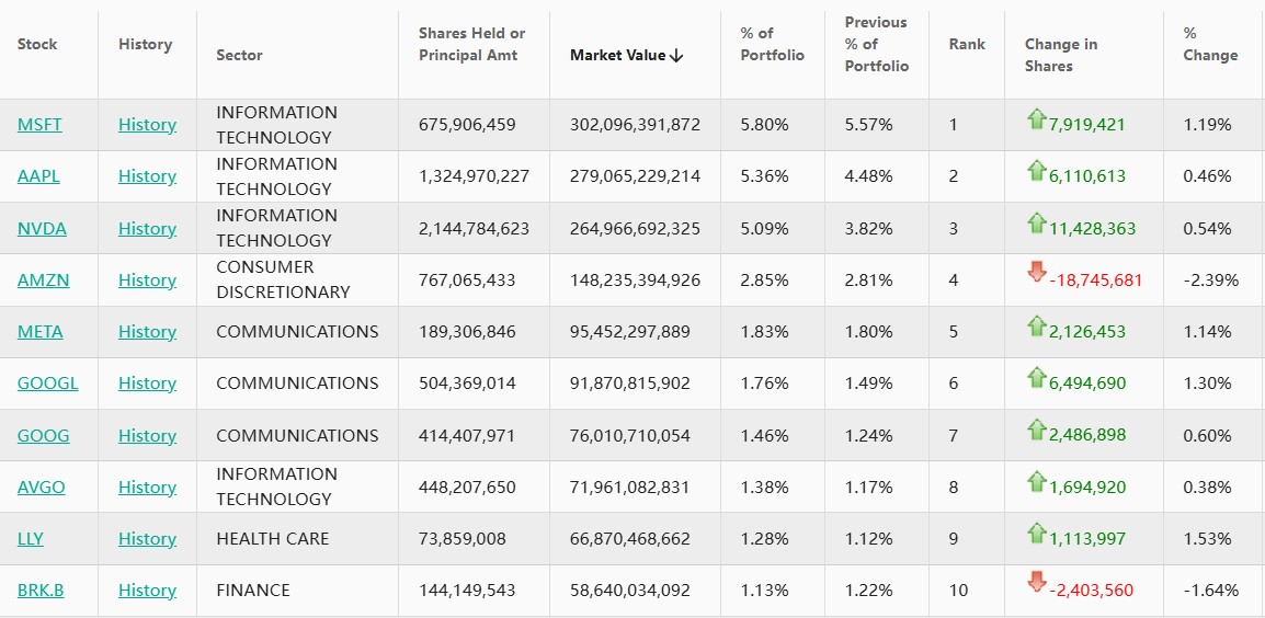 在前五大重仓股中,微软 (MSFT.US) 位列第一,持仓约 6.76 亿股,持仓市值约为 3021 亿美元,占投资组合比例为 5.80%,较上季度的持仓数量增加 1.19%。