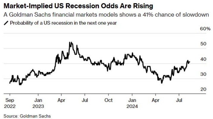 高盛的数据显示,股市和债市目前认为美国经济衰退的可能性为 41%,高于 4 月份的 29%。股市最近一次大幅上涨的原因在于,市场押注美联储将采取更激进的降息步伐,而对商业周期起落较敏感的股票表现滞后。摩根大通的一个类似模型计算出,由于美国国债的大幅重新定价,这种可能性从 3 月底的 20% 跃升至 31%。