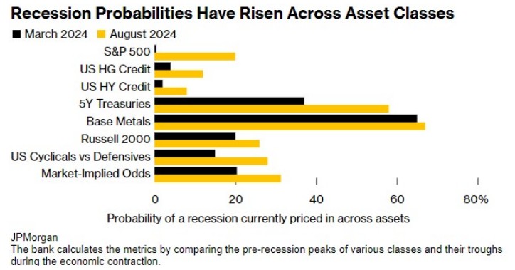 美国市场对通胀降温的预期增强,预计今晚 CPI 将再次显示温和通胀,从而巩固美联储降息预期。市场反应积极,美股和债市齐涨,然而,经济衰退的风险正在上升,高盛和摩根大通的模型显示经济衰退可能性分别为 41% 和 58%。市场普遍预计,美联储将在 9 月降息 25 至 50 个基点,并对 CPI 数据后债市将出现大幅上涨的押注。