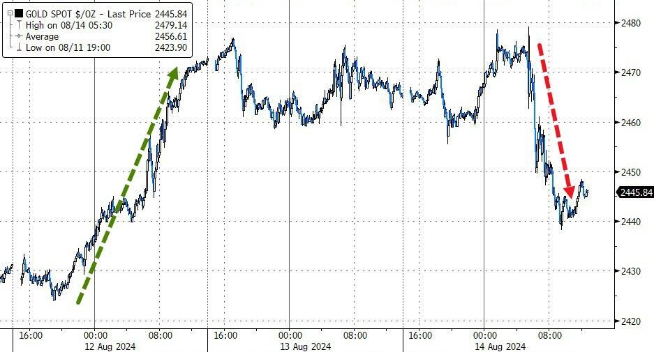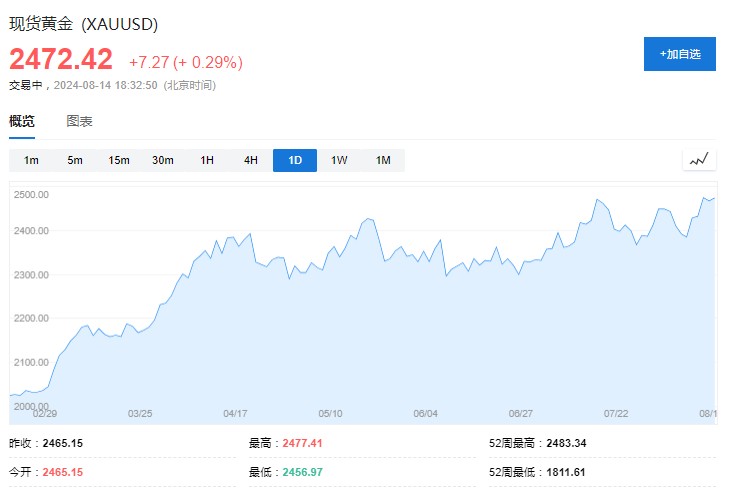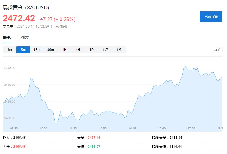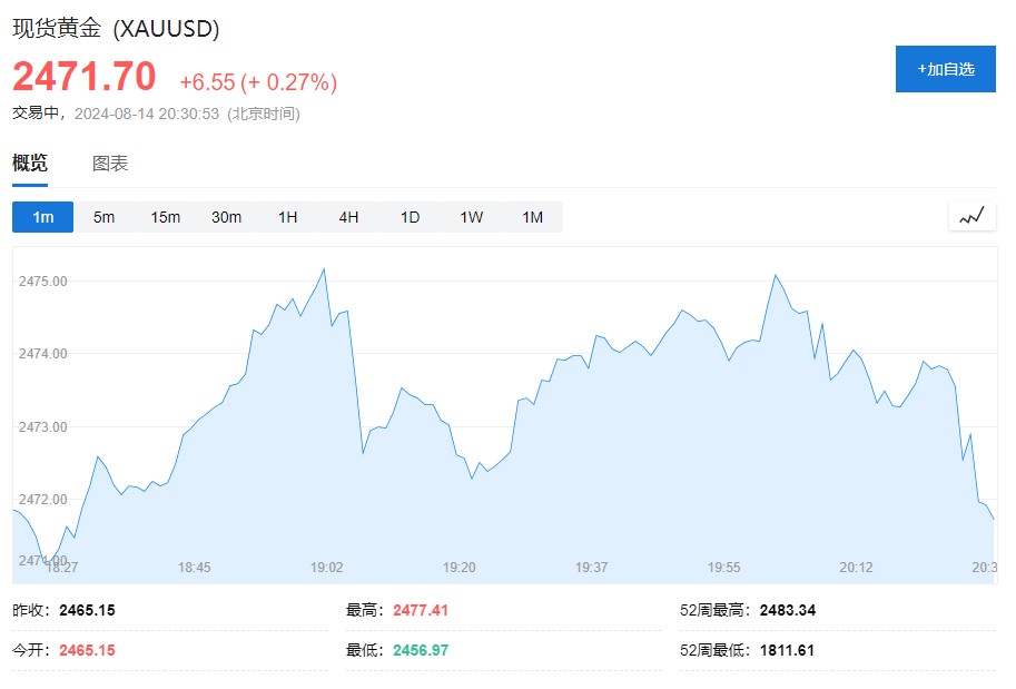 由于降息预期升温,黄金小幅上涨,盘中触及 2478.61 美元,距离上个月创下的纪录高位不到 5 美元。