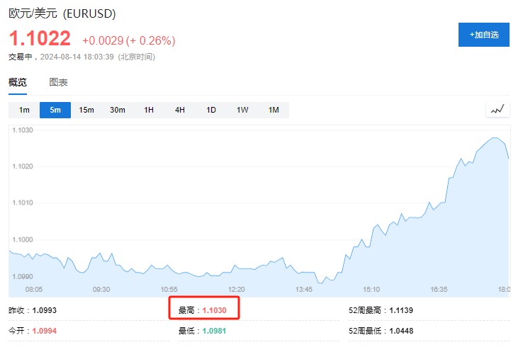 欧元兑美元汇率升至今年以来的最高水平。欧元兑美元上涨 0.3%,至 1.1023,为 1 月 2 日以来的最强水平。