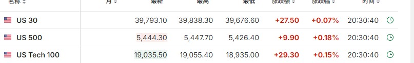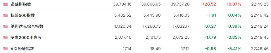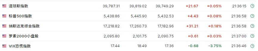 - 美股三大股指小幅收涨:标普 500 大盘收涨 0.38% 至 5455.21 点。道指收涨 0.61% 或 242.75 点至 40008.39 点。纳指收涨 0.03% 至 17192.60 点。纳指 100 收涨 0.09%。衡量纳指 100 科技业成份股表现的纳斯达克科技市值加权指数(NDXTMC)收涨 0.11%。罗素 2000 指数收跌 0.52%。恐慌指数 VIX 收跌 10.65%,报 16.19。