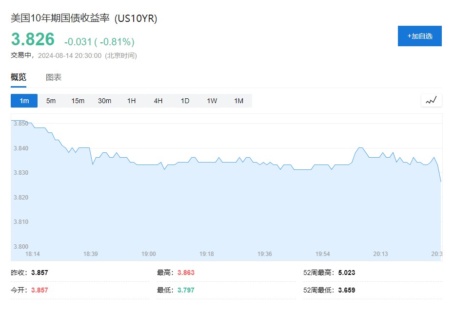 10 年期美债收益率小幅走低 1bp,报 3.826%。