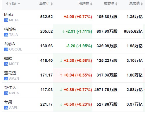 - “科技七姐妹” 跌多涨少。英伟达收涨 1.67%,苹果收涨 0.2%,微软收涨 0.69%,而特斯拉收跌 3.1%,“元宇宙” Meta 收跌 0.34%,谷歌 A 收跌 2.31%,亚马逊收跌 0.08%。