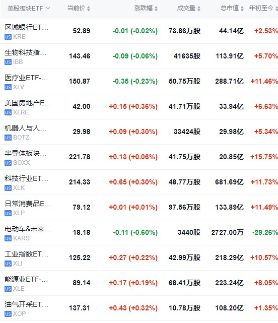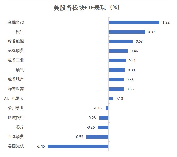 美股行业 ETF 收盘涨跌互现。金融业 ETF 涨逾 1%,能源业 ETF、科技行业 ETF、日常消费品 ETF、全球科技股 ETF 及医疗业 ETF 涨幅均在 0.5% 上下。而全球航空业 ETF、可选消费 ETF 及生物科技指数 ETF 均跌超 0.5%。