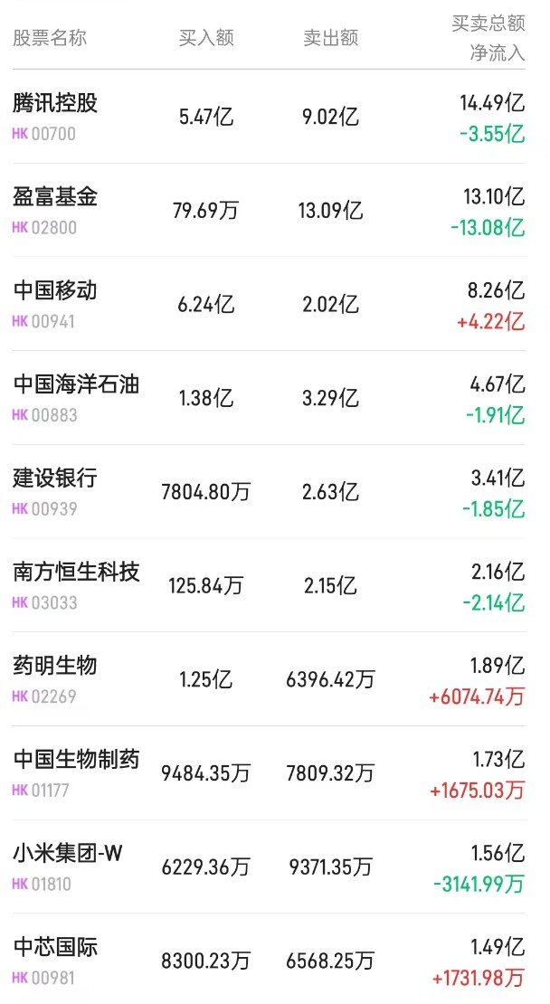 北水净买入最多的个股是中国移动 (00941)、药明生物 (02269)、小米集团-W(01810)。北水净卖出最多的个股是盈富基金 (02800)、南方恒生科技 (03033)、建设银行 (00939)。