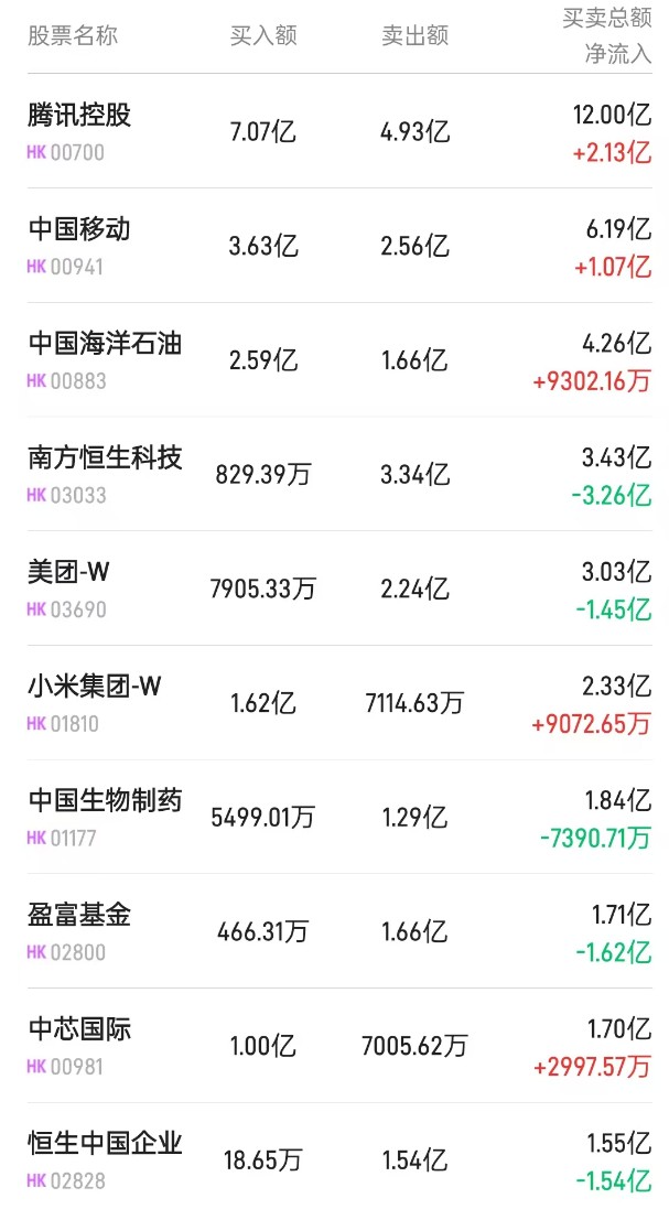 中国移动 (00941) 获净买入 5.29 亿港元。消息面上,中信建投指出,中国移动经营总体保持稳健,个人市场方面,在流量增长放缓的背景下,公司加强应用、权益、终端融合运营,力争个人市场保持平稳;家庭市场方面,在推动千兆宽带持续渗透的同时,加强 “智家 + 内容” 驱动,提升综合家宽 ARPU;政企市场方面,持续深耕行业,沉淀核心能力,提升 B 端项目的盈利水平。若按 72% 派息率计算,公司当前股息率 H 股约 7%,A 股约 4.5%,股息回报仍然具备吸引力。