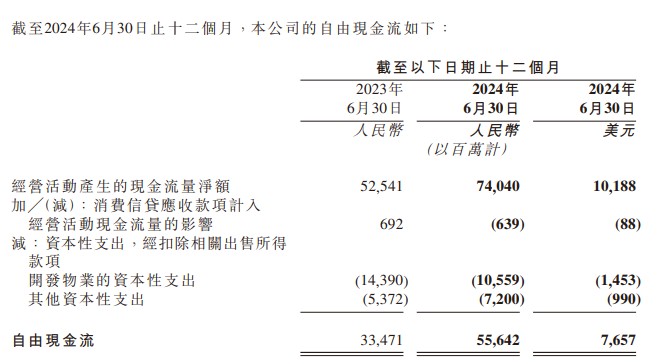 现金流:截至 2024 年 6 月 30 日的过去十二个月,经营活动产生的现金流为人民币 740 亿元(约 102 亿美元),较上年同期增长 40.9%。