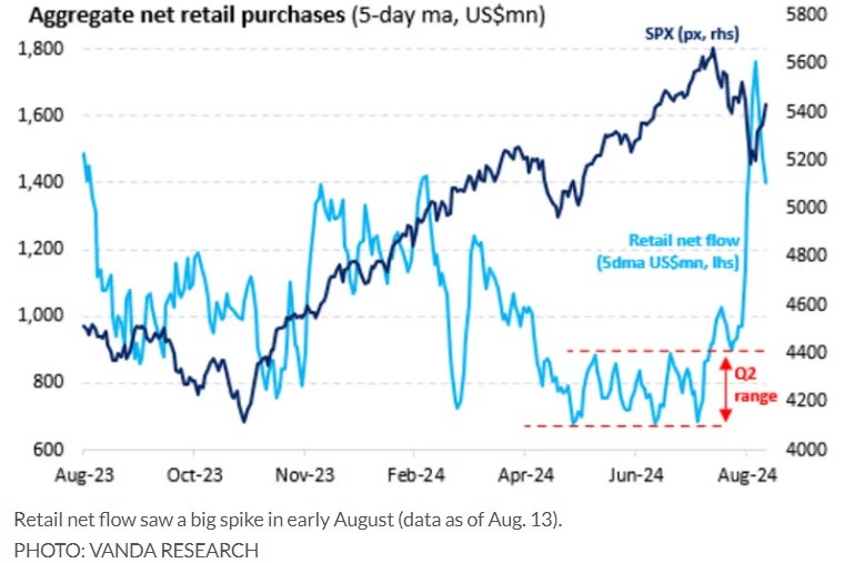 Vanda Research 在周三发布的数据表明,散户投资者在 8 月初的市场混乱中积极买入,这种买入力度打破了散户投资者在第二季度参与较为平淡的趋势,也显示了当股票下跌时 “逢低买入” 的强烈愿望。