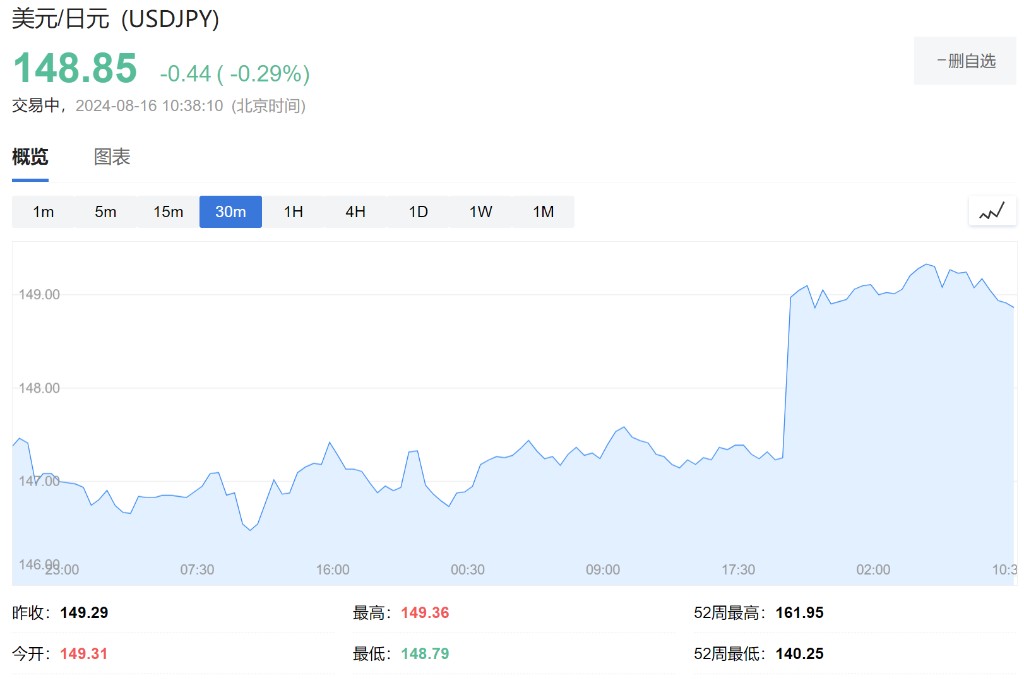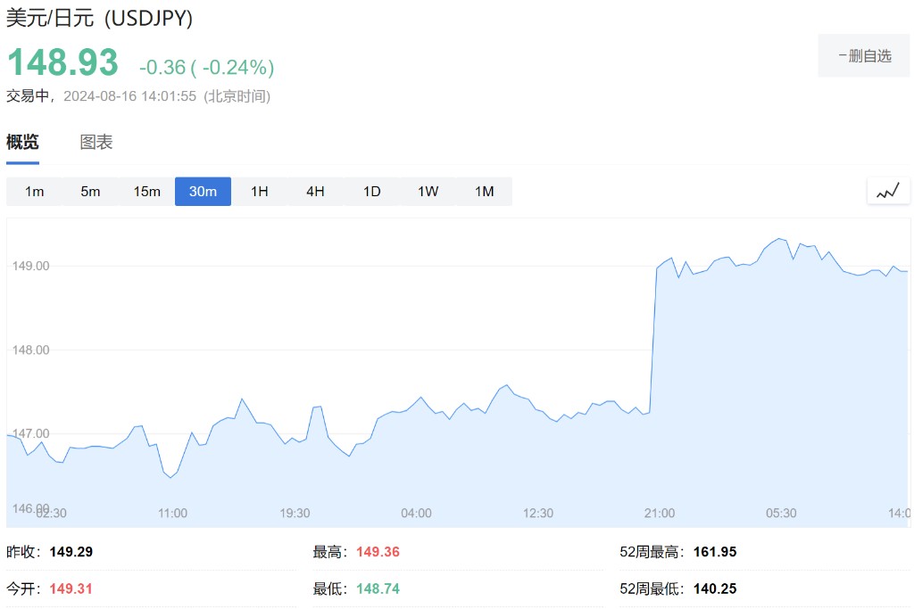 日元微涨,美元/日元下行 0.24% 报 148.93。