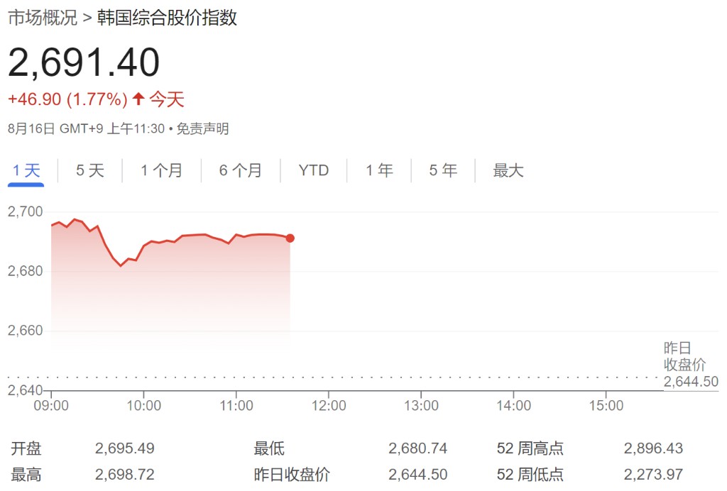 韩国首尔综指涨 2% 报 2696.17,收复自 8 月 5 日下跌以来的全部失地。