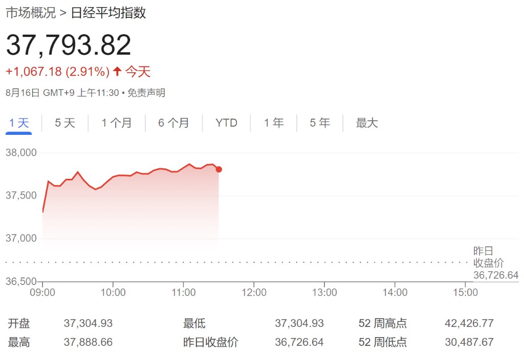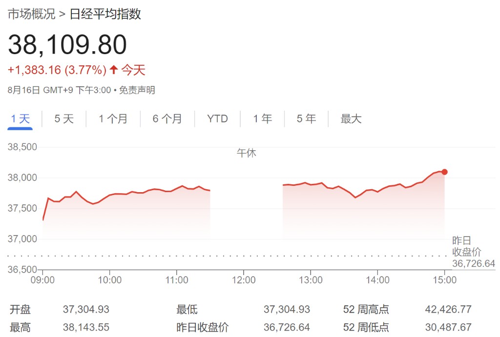 8 月 16 日周三,亚洲股市开盘普涨,MSCI 亚太指数上涨 1%。截至收盘,日经 225 指数收盘涨 3.77% 报 38109.80 点,本周累涨近 9%;东证指数涨 3% 报 2679.06。MSCI 亚太指数涨超 2%。