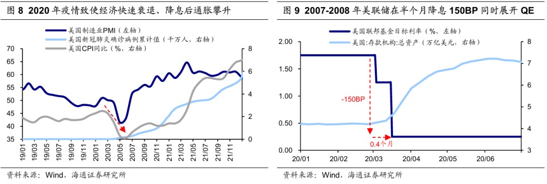 2020 年的降息重点在于应对新冠疫情爆发对美国经济的严重冲击。随着 2020 年初新冠疫情的爆发,全球经济受到巨大冲击,各国纷纷出台疫情防控措施,其中不乏一些对生产、消费产生负面影响的限制性措施。在这种情况下,美国经济在短时间内遭受重创,制造业 PMI 从 2020/01 的 50.9% 回落至 2020/04 的 41.5%。为此,美联储迅速作出降息决策,并于 2020 年 3 月 3 日、3 月 16 日连续两次操作降 150BP,利率一次性降至 0.25% 的最低水平。此外,美联储还重启了量化宽松政策,并启动了一系列紧急贷款计划以支持市场,缓解疫情对经济的巨大冲击。在上述大规模宽松政策的刺激下,美国经济实现 V 形复苏,同时通胀水平也迅速走高,2020/06 起 CPI 同比持续攀升。