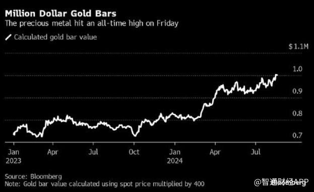 智通财经 APP 获悉,上周五,现货黄金价格超过了 2500 美元/盎司,续刷历史新高,而金条通常重约 400 盎司,这意味着,每块金条价格创下了超 100 万美元的里程碑。当然数据存在细微差别。