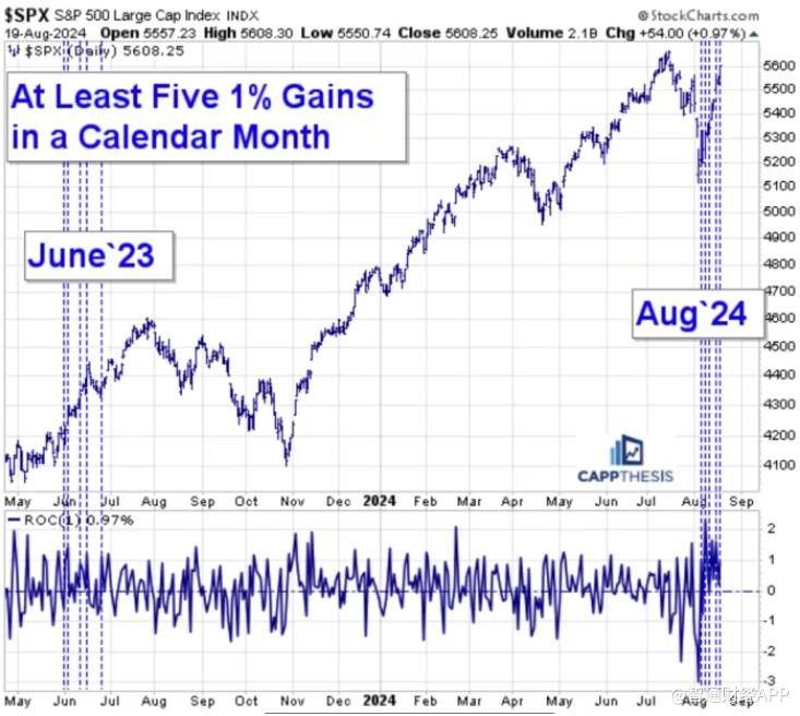 智通财经 APP 获悉,本月股市波动剧烈,标普 500 指数从 8 月初的低迷中强劲反弹,出现了自去年以来最为显著的上涨波动。据独立研究公司 CappThesis 的数据,标普 500 指数在 8 月份已经有五次单日上涨至少 1%,这是自 2023 年 6 月以来,单月内最多的一次。