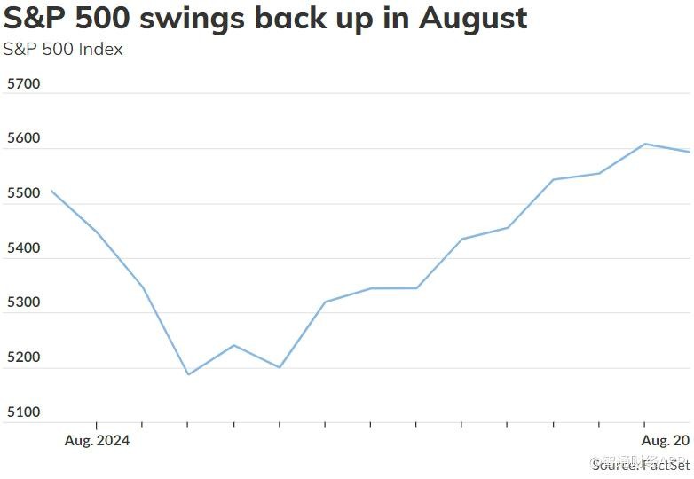 本月美国股市波动剧烈,标普 500 指数强劲反弹,创下自去年 6 月以来最显著的上涨波动。独立研究公司 CappThesis 指出,标普 500 指数在 8 月份录得五次单日涨幅超 1%,表现优于预期。最近的经济数据缓解了投资者对劳动力市场疲软的忧虑,使得市场情绪提升。尽管经历了波折,该指数 8 月份仍上涨 1.5%,并在 2024 年迄今已上涨 17.5%。