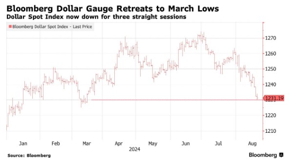 周二,彭博美元指数连续第三个交易日走低,跌至 3 月以来的最低水平,本月迄今为止的跌幅扩大至约 1.9%。在美联储主席鲍威尔和其他官员在怀俄明州杰克逊霍尔举行的年度研讨会上发表讲话之际,交易员正在期待有关降息规模的任何线索。