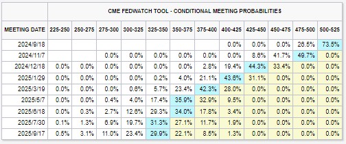 目前,市场已经笃定美联储 9 月份将开始降息,疑问在于是降息 25 个基点还是 50 个基点。根据 CME 美联储观察工具,投资者普遍押注 9 月降息 25 个基点,降息 50 个基点的可能性约为 26.5%。