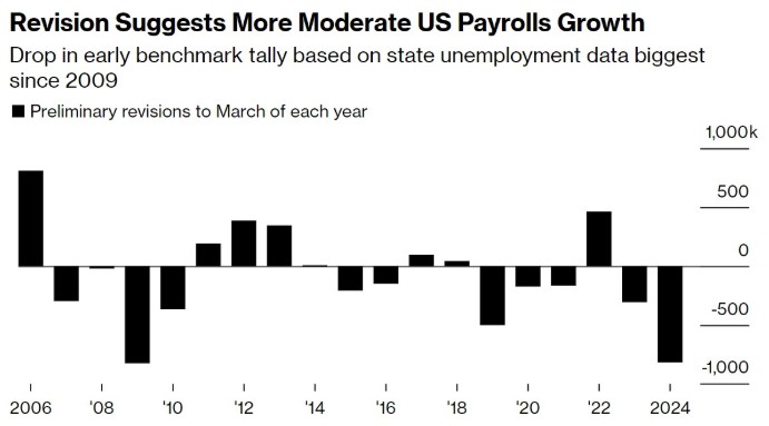 但现在情况可能正在改变。随着美国消费支出亮起黄灯,消费者支出背后重要的支撑——美国就业市场——也出现了放缓迹象。美国劳工统计局周三宣布,在截至 2024 年 3 月的 12 个月内,非农就业数据初步下修 81.8 万人。美国就业增长可能远不如之前报告的那么强劲,这给美联储下个月降息带来理由。