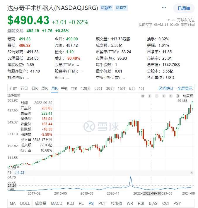 美股目前高位调整,距离指数突破仍有距离,但新高公司层出不穷,Ai 的股票暂时高处不胜寒,但蓝筹股中,很多过去几年累积涨幅不高的,在财报的一点利好催化下马上新高。不经意间,一些行业的龙头座次已经更替。看到医疗板块,后疫情的阴霾依然存在,板块整体指数依然难攀 2021 年的疫情顶,但医药板块和器械板块都涌现了新的龙头。礼来取代辉瑞,成为市值一哥,尽管收入利润还在追赶,但市值已是辉瑞 3 倍。而医疗器械领域,美敦力也被收入尚为 1/3 的达芬奇手术机器人取代。减肥兼糖尿病神药的巨大前景,大家也看得到。但达芬奇机器人的市值越过美敦力、史赛克、波士顿科学等诸多医药器械巨头,这显然是不被注意到的,怎么医疗器械板块也变了天?手术机器人是蹭上了 Ai+ 人型机器人风潮,还是真实的巨大前景即将释放? 从业绩上看,其实达芬奇手术机器人远远称不上完美,从最新一个季度披露的业绩看,营收增长约 14%,环比增速 5%,在美股这算不上高增速。而利润方面,毛利率依然是 70% 左右,利润率仍不如 2021 年 30% 最高水平,目前仍然是 26%,利润是单季度 5.3 亿,相对 1700 亿的市值差距巨大,尽管利润增速表现比营收好,达到了 20%,但这仍然不是一个令人惊喜的数据。而业绩指引方面,手术指引增速与上半年接近,也没什么惊喜。唯一的亮点可能是新产品达芬奇 5 落地顺畅,订单大增,但这并没有影响业绩太多。并且公司也提到,这个季度的毛利率有一次性拔高的影响,长期毛利率还是很难高于 70%,手术机器人依然是一个高精密的硬件,涉及复杂的制造工艺,这类硬件无法通过规模化降低的大制造成本,让这个行业难以出现像制药那样动辄 80%+ 的毛利率。 达芬奇的财报数据跟制药领域的诺和诺德和礼来相比都相差甚远,这两个涨势凶猛,但业绩成长也凶猛。在估值上,达芬奇要比他们离谱得多,达芬奇的 PS 为 22 倍,PE 为 90 倍,并且是没有其他波动因素干扰的业绩。可以说,市场对这个公司预期非常高,高到难以理解。这么高的定价,也很难不让人把逻辑跟特斯拉联想起来,除了自动驾驶,特斯拉还有人型机器人的概念来维持畸高的估值,Ai 能够听懂语言指令后,可以在工业领域结合硬件重塑生产力,进一步提升自动化效率,特斯拉是代表工业方向的话,那么达芬奇就是代表医疗方向。不过从目前产品的应用角度看,达芬奇目前的产品形态,跟自动化机器人也没有什么关联,其操作还是基于医生的动作,只不过是把医生的动作映射到了机械臂上,以提高准确度,减少医生疲劳度,提高效率,提升手术质量罢了。离了医生,或者抛下一个治疗指令驱动机器运作,是根本不可能的。 达芬奇机器人系统,目前看起来,更像是拖拉机之于农民、汽车之于时机、电脑之于工程师。称之为机械臂比机器人更加贴切,商业模型也跟这些产品类似。今天 Ai 在大模型的应用,对于达芬奇机器人目前的操作模式来说,改善的意义自然是不大的。显然,当前的业绩,或者 Ai 的风潮,其实都还是难以去解释公司这样的估值。而从数据上看,医疗器械领域原先的几个市值龙头目前的低估,也有理由,单比较净利率,就能看出一点差距,并且增速也不亮眼,与它们相比,达芬奇机器人是鹤立鸡群的。 上面提到的美敦力、波士顿科学、史赛克等龙头公司,目前的净利润率都不是很理想。它们跟达芬奇其实不是同一类公司,这几家公司几乎覆盖了医疗器械耗材等大部分领域,旗下产品线广阔,从心血管到神经到手术机器人到糖尿病耗材,几乎所有的医疗器械,都能找到美敦力、波士顿科学或旗下品牌的身影。大而全是对这几家公司的认知。但大而全的另一面,则是产品线庞大,研究投入分散,难以形成规模效应,靠 1000 个产品产生的 100 亿收入,要有高利润率,显然要比一个大单品 100 亿收入难得多。而且耗材涉及科技含量不低,但却是大众消费品,使用量也不会特别高,规模流水线很难,不同类别的医疗器械,生产线不能共用,最终就是,产线庞大,研发效率也很难集中,反倒是那些在聚焦于某个疾病治疗中的大单品器械的公司,可以单点突破,取得不错的营收的利润率表现。 像产品只有手术机器人及其配套服务的直觉外科,手术机器人及其使用耗材,但加起来也没有美敦力一个心脏产线的所有支架型号多。同理,爱德华兹科学产品线简单,只是聚焦 TAVR,但也能挤入市值前 10。都是大单品策略下的成功者。所以这也解释了它们利润率高于行业的特点,而估值高也非常合理。达芬奇手术机器人的商业模式更应该对标的是曾经的西门子医疗和 GE 医疗公司,这两家公司收入占比最大的是影像设备,基本就是医院最贵的 MRI 等设备的供应商。这些先进的医学影像设备也很好地解决了医生肉眼无法完成的复杂诊断任务。但这两家公司,目前市值的表现也差强人意。如果将他们跟达芬奇对比,则能发现几点差异。首先医学成像设备已经渗透了几十年后,在医疗机构中的使用已经很普遍,销量提升空间有限,这些公司为了成长和规模,目前都已经开发多类别医疗设备的产品线,相对而言产品线已不简单。而目前达芬奇手术机器人在许多手术中的应用还未落地,每一类新手术的验证都将扩大产品销量,目前也只是仅用于腔镜手术,如普外科、泌尿科和妇科手术等。骨科和肺部手术这些都在验证放量中,手术机器人具有很强的通用性,拓展应用的前景还很大。