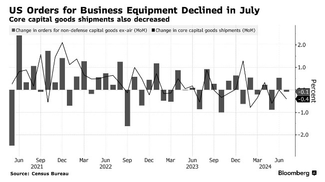 核心资本货物出货量(用于帮助计算政府国内生产总值报告中的设备投资)在第三季度初下降了 0.4%。在报告发布之前,亚特兰大联储的 GDPNow 预测显示,7 月至 9 月期间企业设备支出将小幅增加。