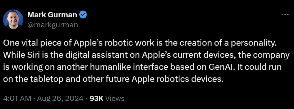 8 月 26 日,Gurman 在社交媒体上发文称:苹果制造机器人的一个重要部分是创造机器人的个性。苹果正在开发基于生成式 AI 的类人界面,这一类人界面可以在桌面和未来其他苹果机器人设备上运行。