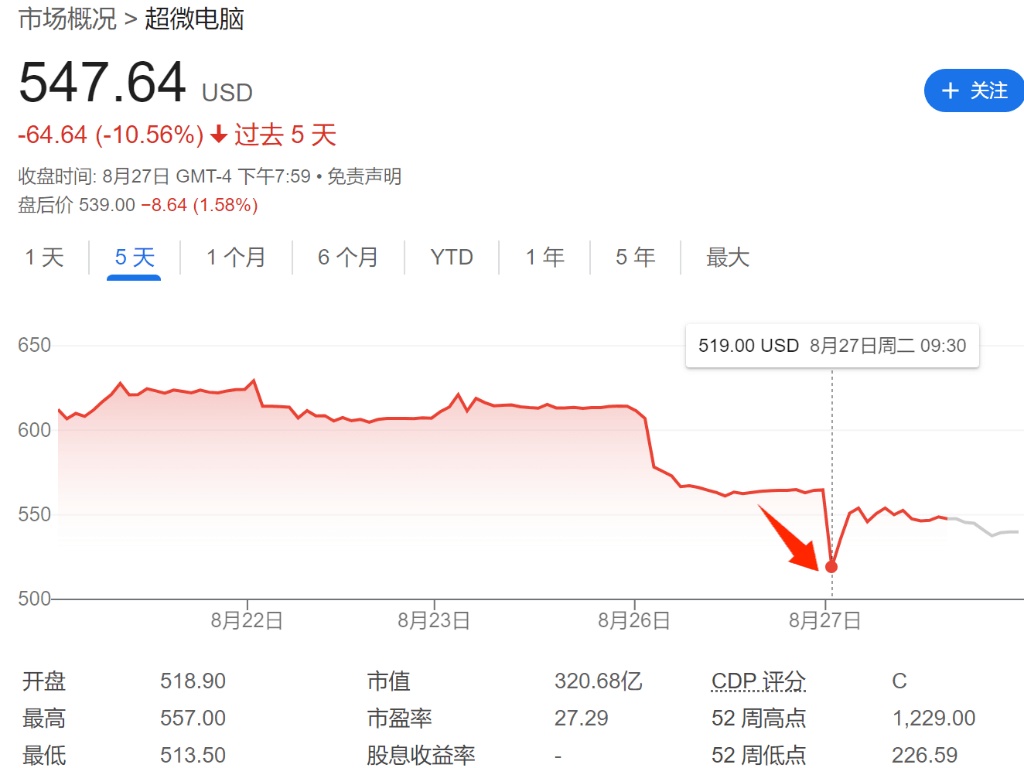 在此消息发布后,27 日超微电脑美股盘中一度下跌了 8.7%,但收盘跌幅收窄至 2.6%,至美 547 美元/股。超微电脑尚未立即回应置评请求。