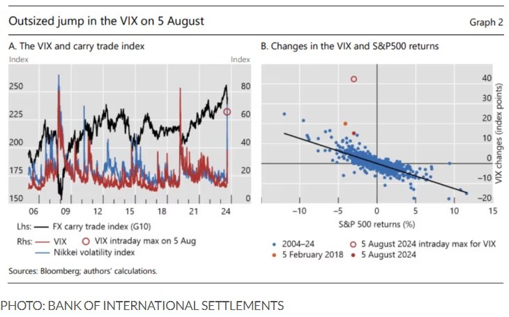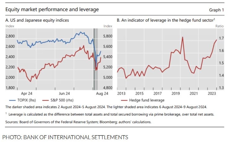 国际清算银行 (BIS) 的经济学家分析了 8 月 5 日全球金融市场崩溃的原因,尽管市场迅速恢复,但风险仍高。报告指出,推动市场波动的因素并没有显著变化,而交易者因低波动性而加大杠杆,这再次引发市场的脆弱性。虽然日元套利和其他投资策略导致了初步抛售,但其影响在于整体杠杆使用,清算机构要求更高资本以覆盖风险,引发追加保证金通知。