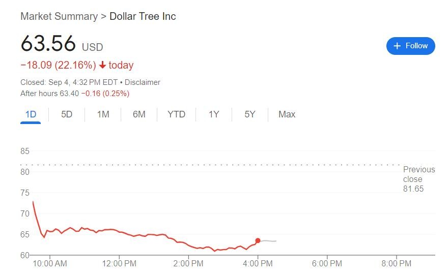财报公布后,Dollar Tree 股价周三跳空低开近 11%,早盘跌幅即超过 20%,午盘跌幅保持在 20% 以上,刷新日低时跌 25.5%,最终收跌近 22.2%。