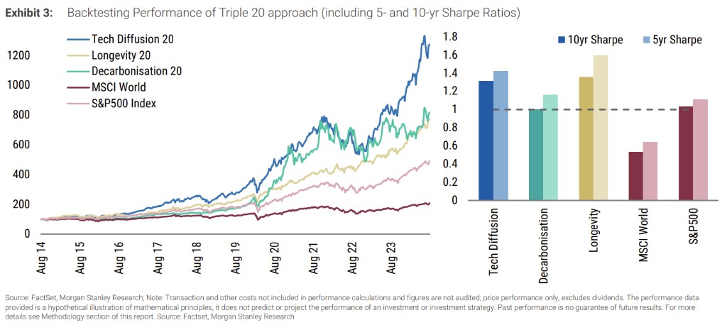 然后,Edward Stanley 团队根据相对于分析师基准目标价格的上行潜力对输出结果进行排名,根据以上方法得出的股票,夏普比率显著高于市场平均水平,尤其是长寿主题的股票。