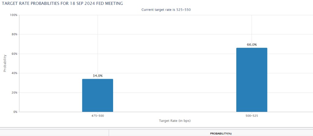 目前期货市场定价显示,美联储 9 月 18 日降息 25 个基点的概率为 66%,降息 50 个基点的概率为 34%。分析认为,符合预期的 CPI 将巩固降 25 个基点的预期,而任何超预期的降温都将增加投资者对降息 50 个基点的押注。