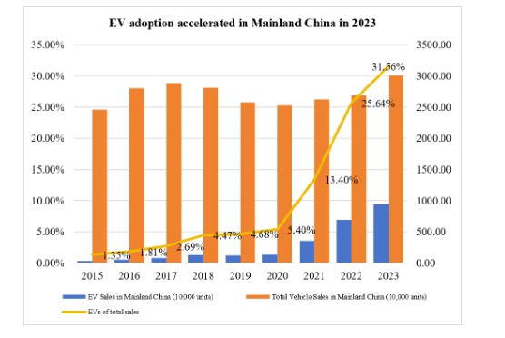 据中国汽车协会制造商(CAAM),2015 年中国汽车总销量为 2460 万辆,电动汽车总销量为 331100 辆。渗透率仅为 1.35%。到 2022 年和 2023 年,中国电动汽车的渗透率分别达到 25.64% 和 31.56%。 根据中国乘用车协会(CPCA)的数据,2024 年上半年,电动汽车累计销量同比增长 37.2%。