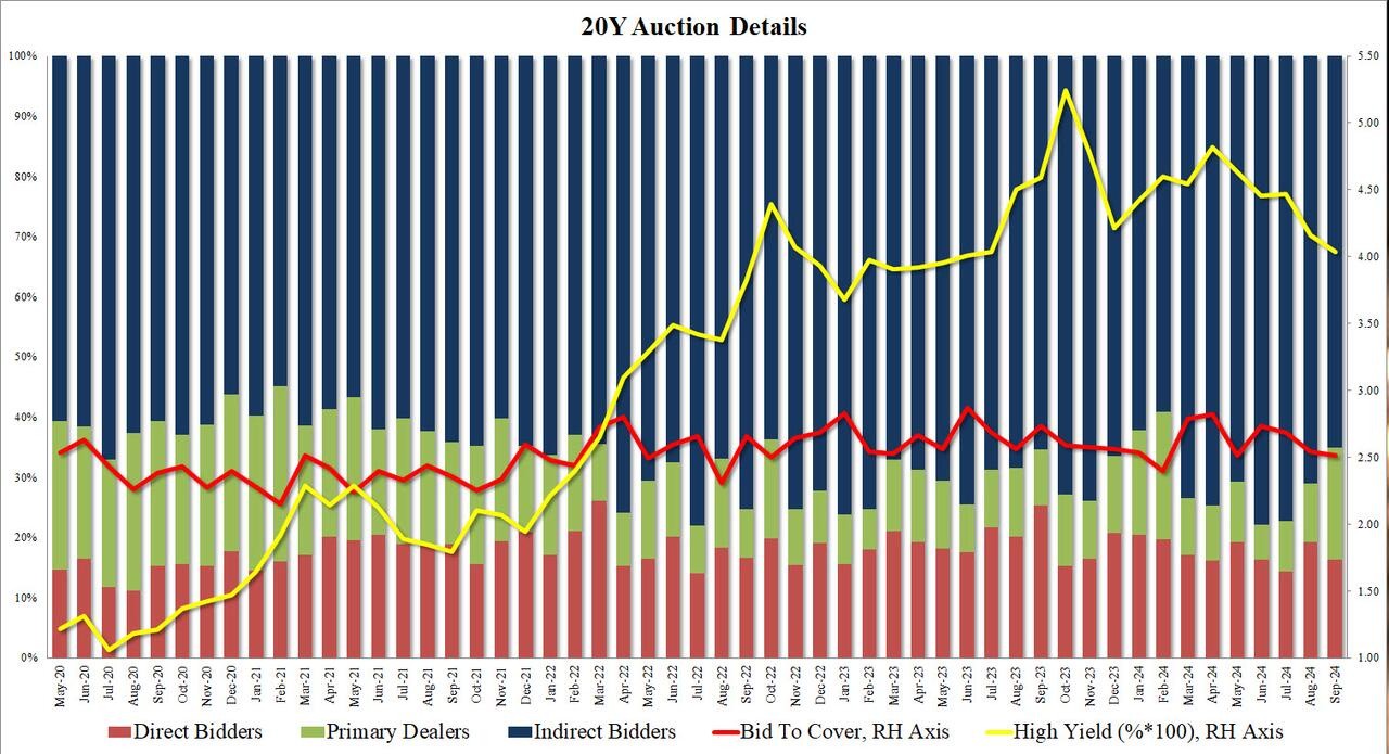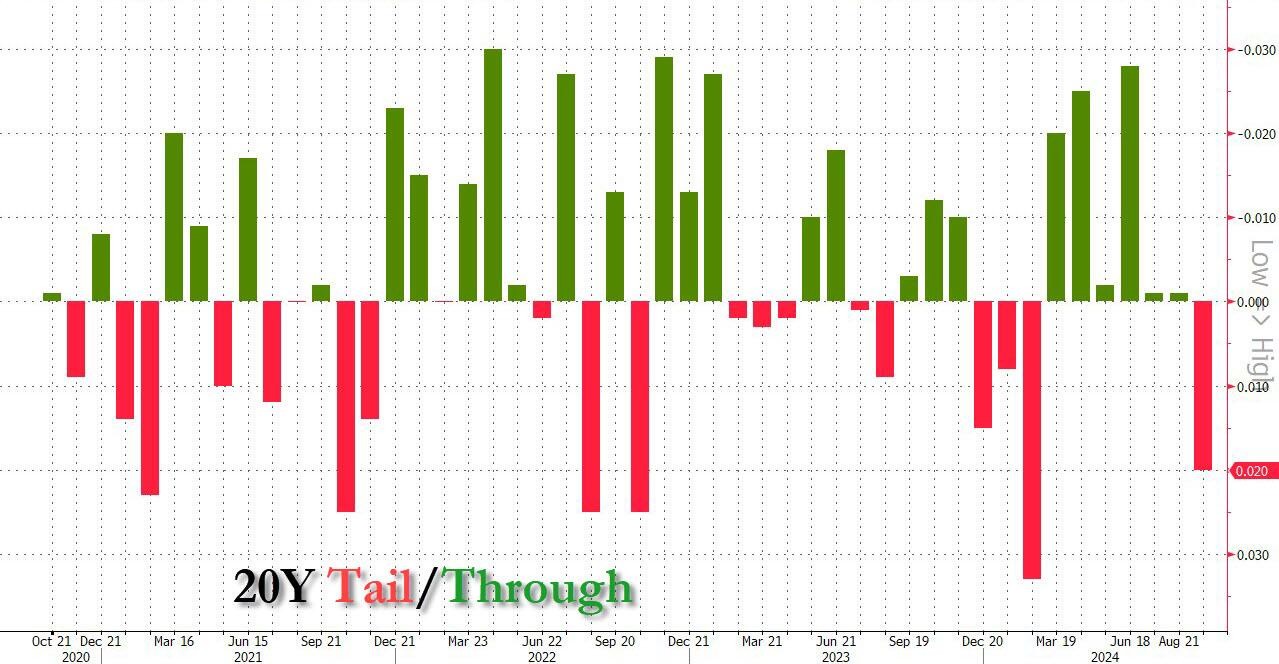 9 月 17 日周二,美联储 9 月利率决议公布前夕,美国财政部拍卖 130 亿美元 20 年期国债。整体来看,拍卖结果不佳,需求远低于预期。