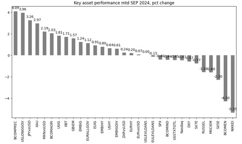 Vladimirov 指出,从当前资产表现看,9 月期间,黄金、美国长债和日元的表现优于其他资产,而日经指数、能源和欧洲斯托克 50 指数则出现亏损。而这种市场表现通常和美国及全球经济增长疲软相伴出现,在此情况下市场会普遍预期央行放宽货币政策,从而进行 “量化宽松(QE)交易”。